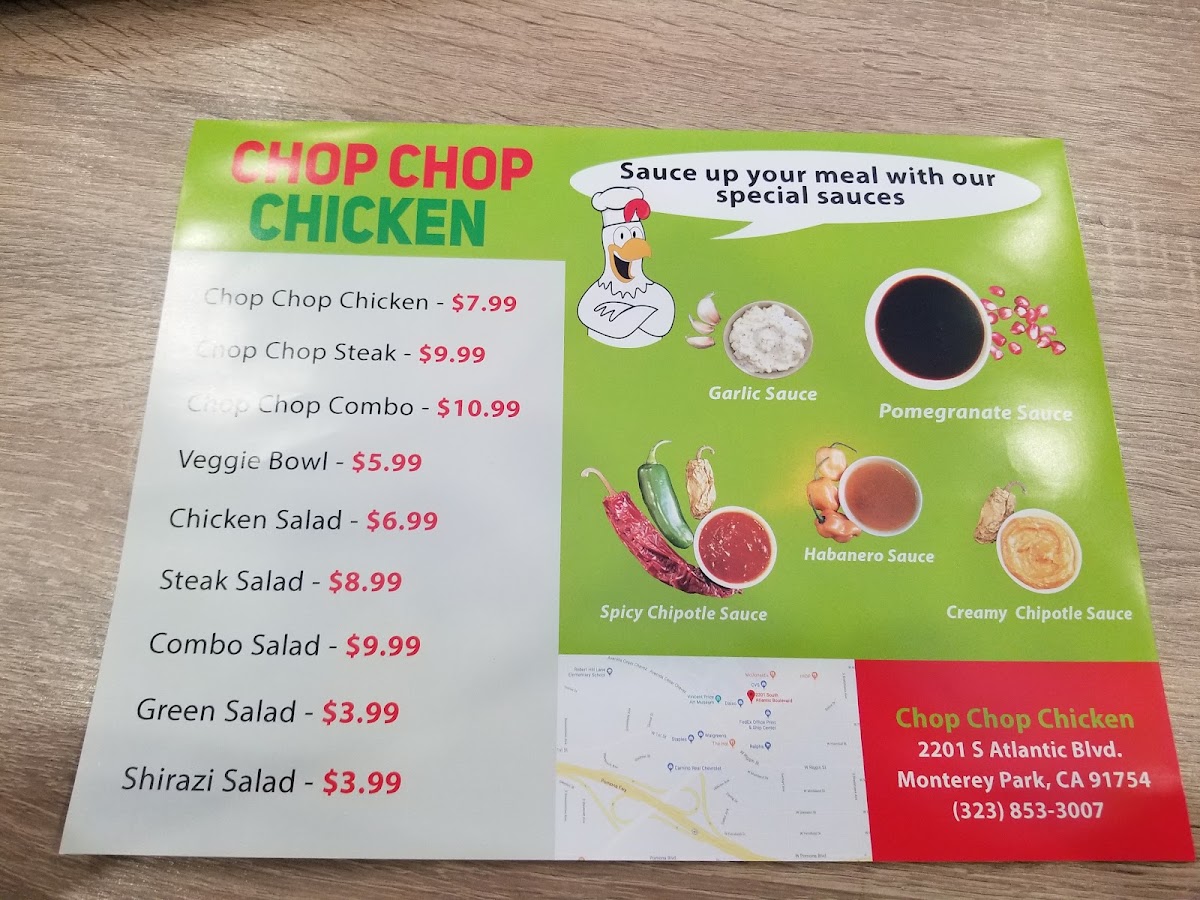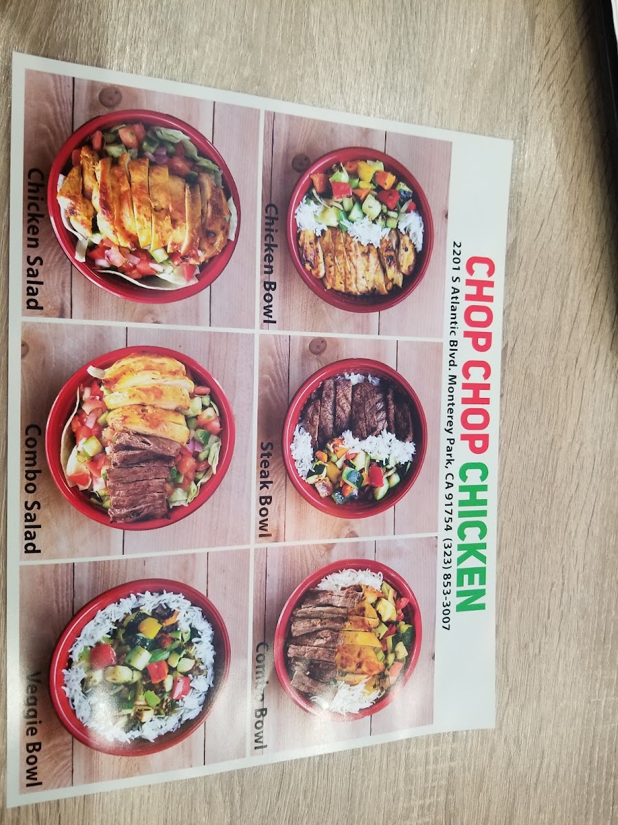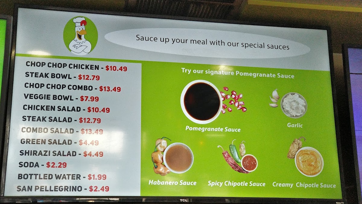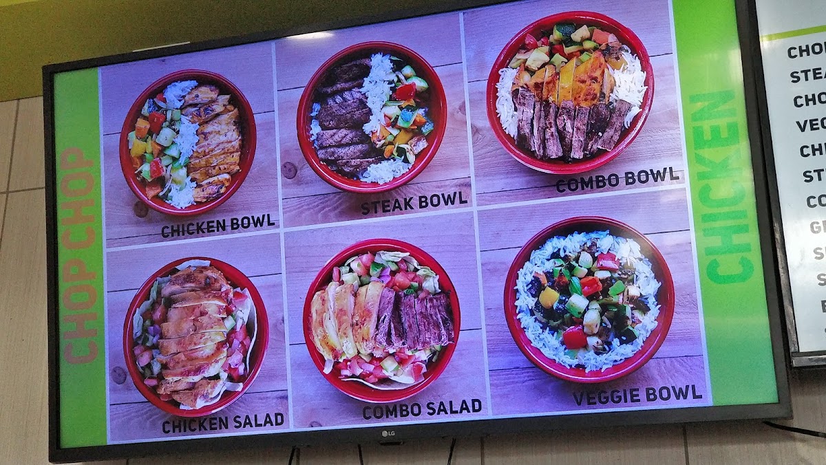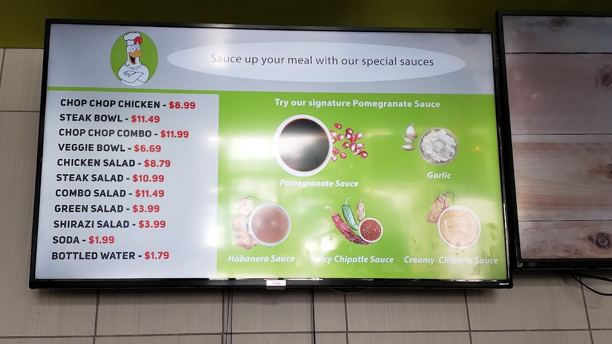 Chop Chop Chicken offers a diverse and satisfying menu, with options that cater to a variety of tastes. The Combo Salad, Chicken Salad, Steak Salad, Shirazi Salad, and Green Salad provide fresh, healthy choices to start your meal. For something heartier, the bowls section offers the Chop Chop Combo Bowl, Chop Chip Chicken Bowl, Steak Bowl, and Veggie Bowl, each bringing its own unique flavor. If you prefer to customize your meal, the Chicken Only A La Carte, Steak Only A La Carte, Veggies Only A La Carte, and Rice Only A La Carte offer flexibility and the opportunity to build your perfect plate. To accompany your meal, there are refreshing drinks like San Pellegrino, Fountain Drink, and Bottled Water. With a variety of options at affordable prices, Chop Chop Chicken provides something for everyone, making it a great choice for a quick, delicious meal.